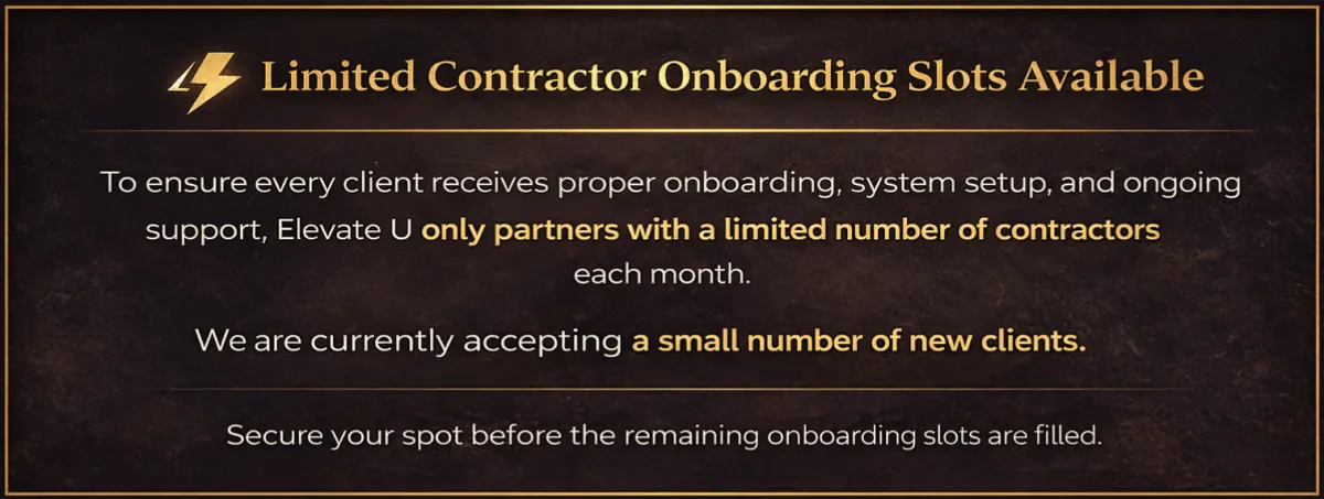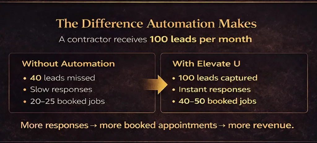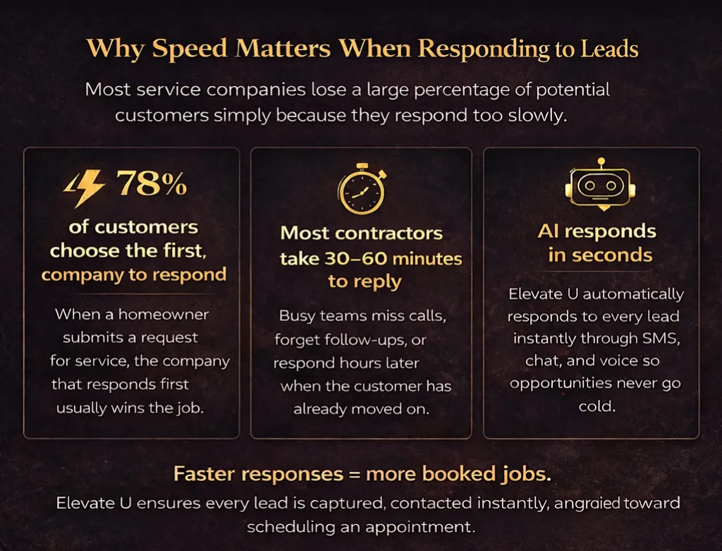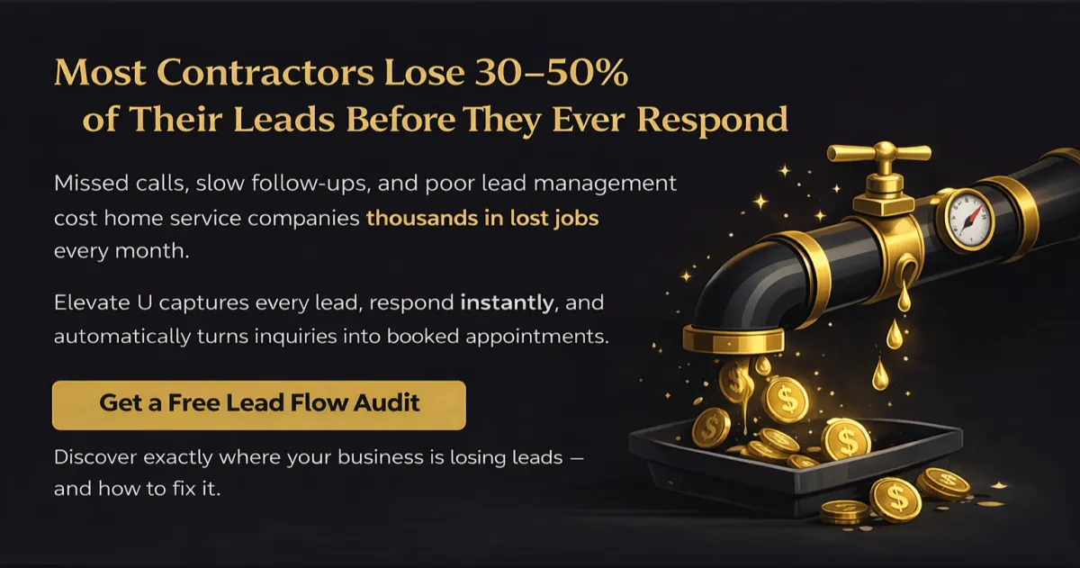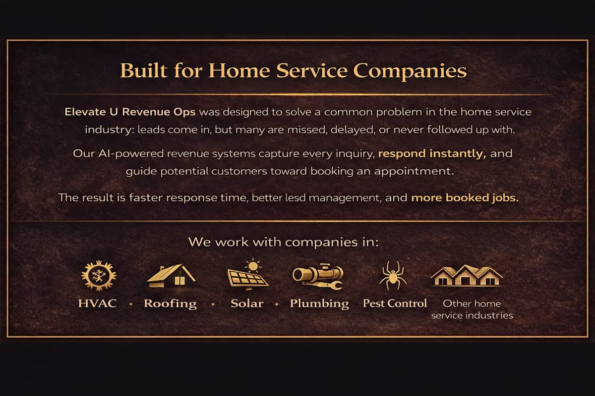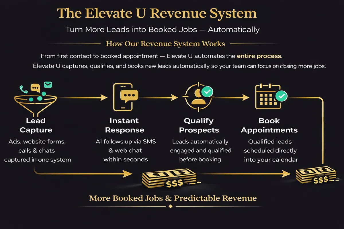 Elevate U Revenue Ops helps home service companies capture more leads, respond instantly, and automatically book qualified jobs.